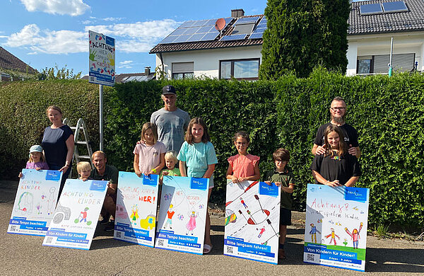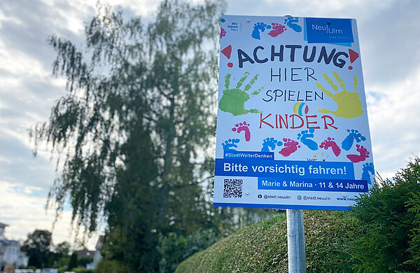 Ihre Idee: In besonders stark betroffenen Gebieten soll auf spielende Kinder hingewiesen werden. Ziel ist es, dass Fahrzeuglenker achtsamer unterwegs sind und den Fuß vom Gas nehmen. Im Frühjahr hat die Verwaltung daher über die städtischen Social-Media-Kanäle interessierte Kinder und Familien gesucht, die bunte Motive für die Hinweisschilder gestalten. Die eingereichten Entwürfe hat Yvonne Schefler vom Neu-Ulmer Stadtmarketing auf Schilder übertragen lassen. Alexander Mangold hat zusammen mit seiner Abteilung Straßen- und Verkehrsrecht die passenden Stellen zur Platzierung der Schilder ausgewählt. Die ersten zwei Schilder konnten jetzt mit Hilfe des Baubetriebshofes im Bereich Reiherweg und Falkenweg in Ludwigsfeld aufgestellt werden.