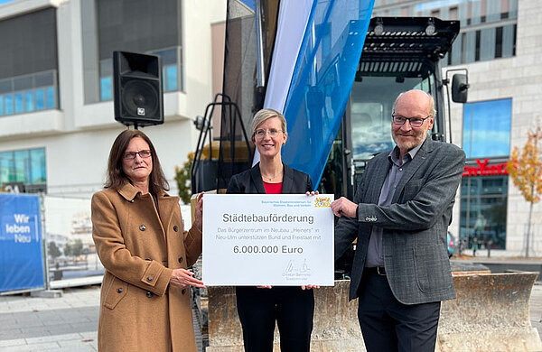 Ministerialrätin Petra Kramer (links) vom Bayerischen Staatsministerium für Wohnen, Bau und Verkehr überreichte einen symbolischen Scheck in Höhe von 6 Millionen Euro an Oberbürgermeisterin Katrin Albsteiger und Berthold Stier, Geschäftsführer der Entwicklungsgesellschaft Neu-Ulm.