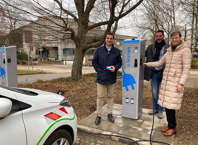 SWU-Geschäftsführer Klaus Eder, Manfred Weise, Leiter des Edwin-Scharff-Hauses und Oberbürgermeisterin Katrin Albsteiger freuen sich über die neuen Elektroladestationen in Neu-Ulm.