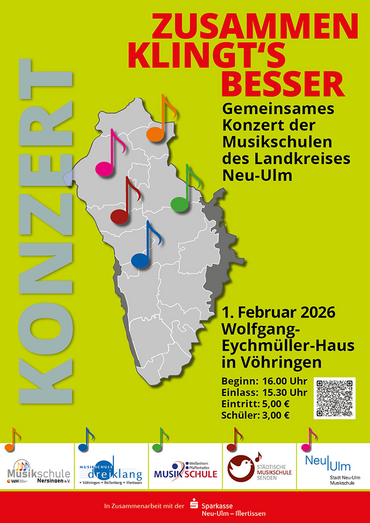 Unter dem Motto „Zusammen klingt’s besser“ wird das Wolfgang-Eychmüller-Haus in Vöhringen am 1. Februar zur klingenden Begegnungsstätte der Musikschulen im Landkreis: Kinder, Jugendliche und Lehrkräfte aus allen fünf Einrichtungen stehen gemeinsam auf der Bühne und zeigen, wie viel musikalische Kraft im Miteinander entsteht.